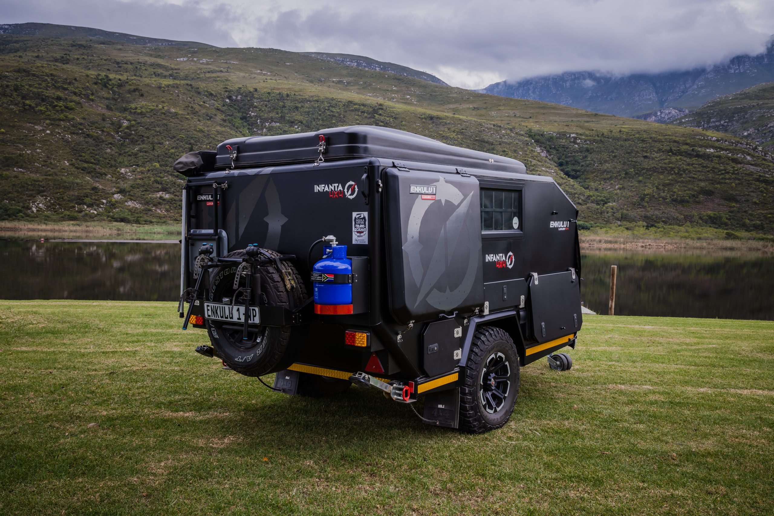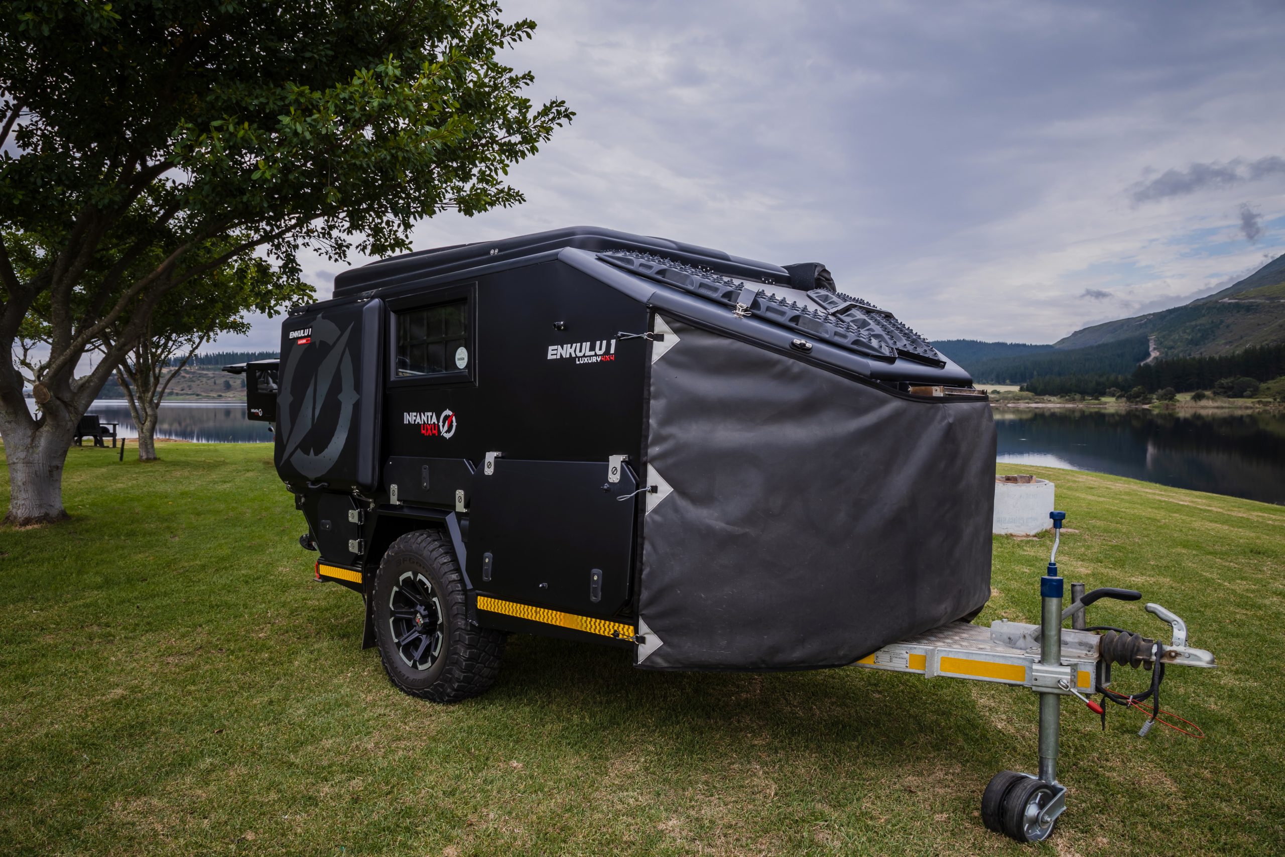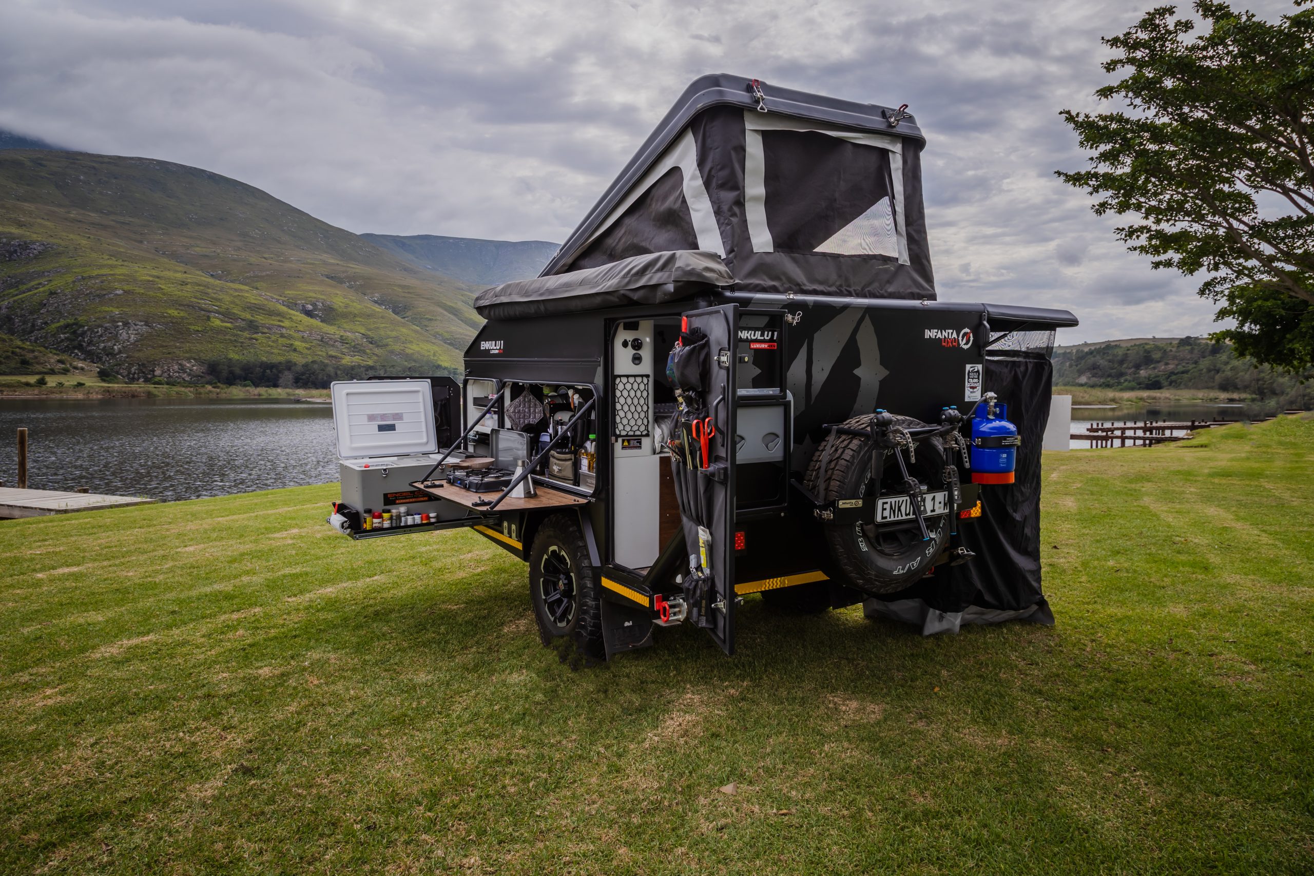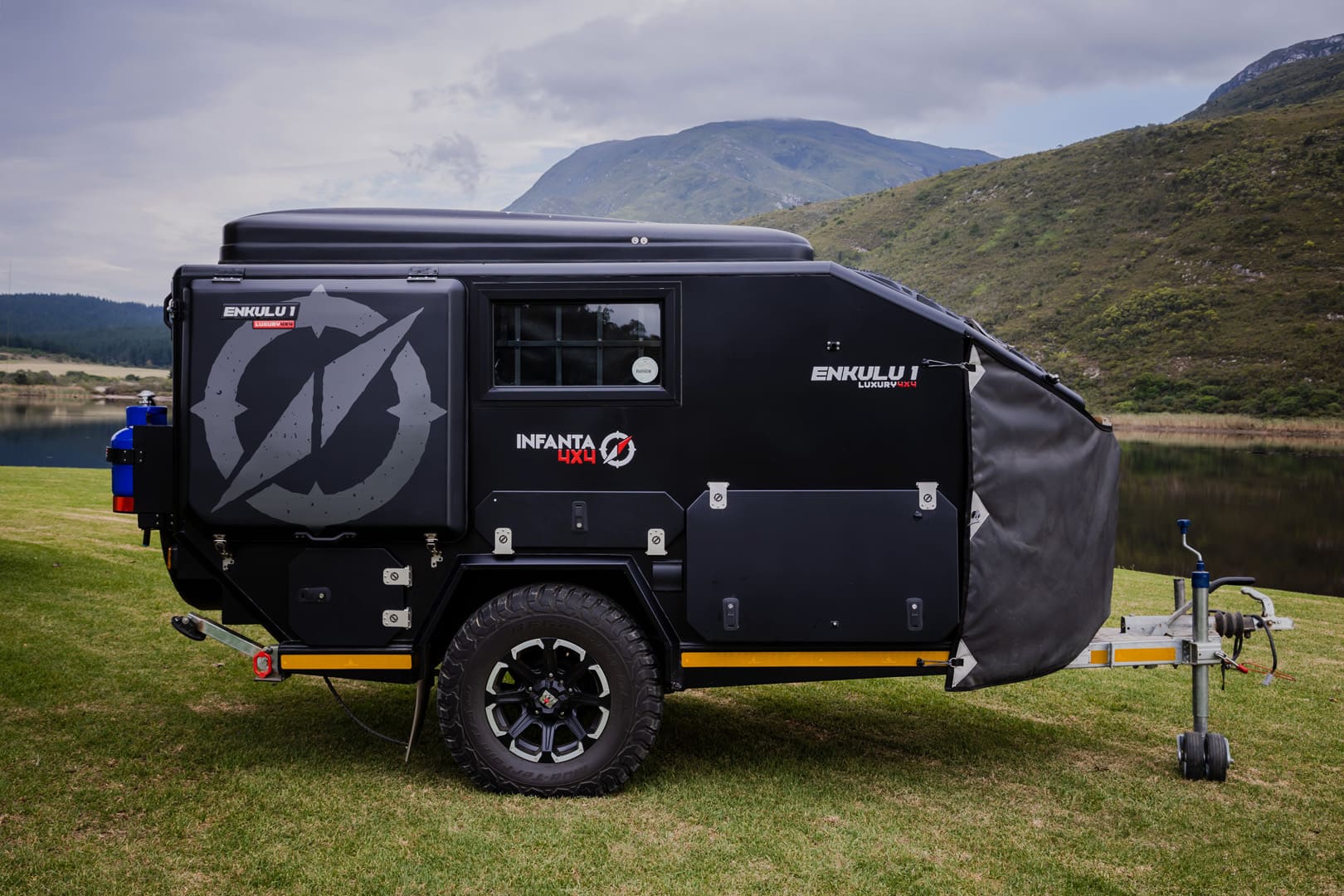 Discover the Infanta Enkulu 1, a compact and robust caravan designed for the adventurous at heart. Equipped with features that maximise both convenience and efficiency, this caravan offers a streamlined aerodynamic design, quick setup, and is crafted from durable aluminium and polycarbonate. Perfect for couples ready to explore, the Enkulu 1 includes a range of modern comforts such as LED lighting, a built-in battery system chargeable via your towing vehicle, and optional air conditioning. Whether tackling rugged 4×4 trails or enjoying a cosy setup under the stars, the Enkulu 1 provides a perfect blend of mobility and home-like comfort, equipped for any journey.