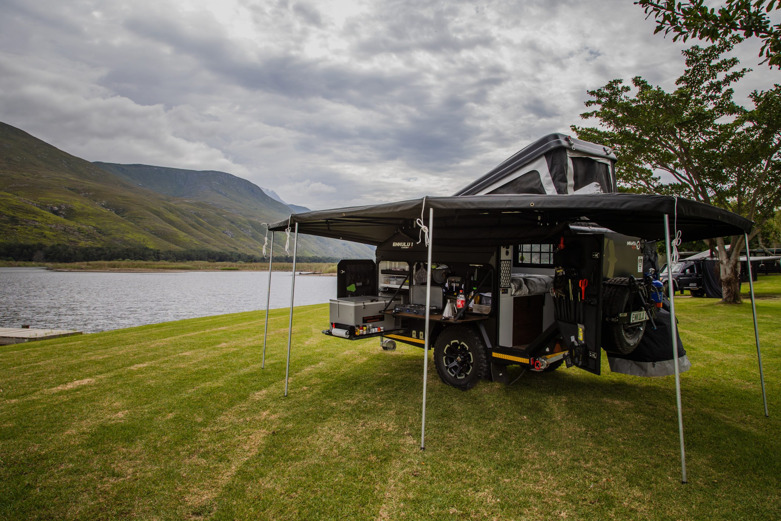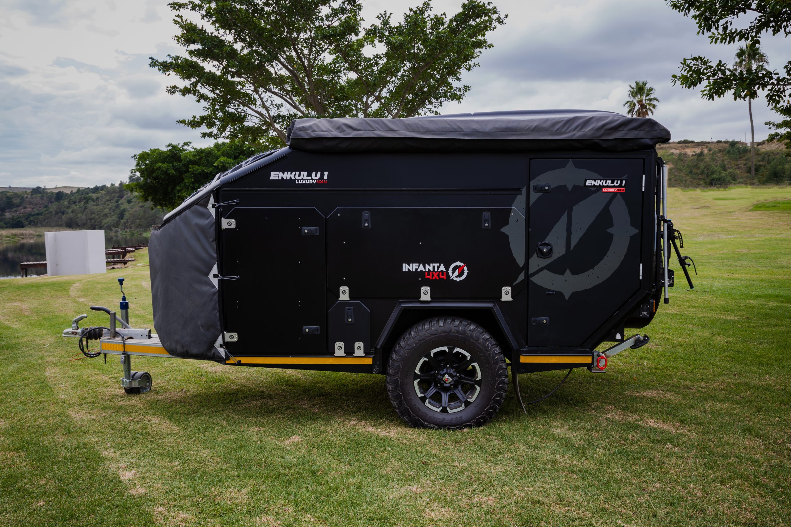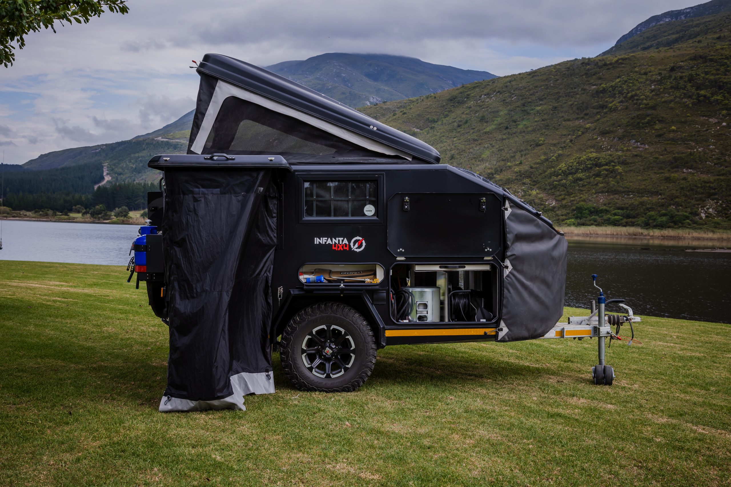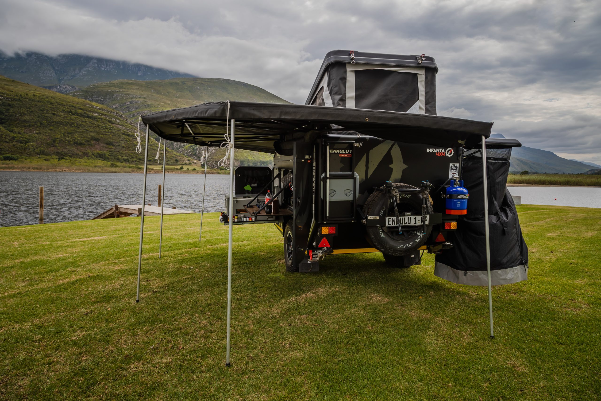 Discover the Infanta Enkulu 1, a compact and robust caravan designed for the adventurous at heart. Equipped with features that maximise both convenience and efficiency, this caravan offers a streamlined aerodynamic design, quick setup, and is crafted from durable aluminium and polycarbonate. Perfect for couples ready to explore, the Enkulu 1 includes a range of modern comforts such as LED lighting, a built-in battery system chargeable via your towing vehicle, and optional air conditioning. Whether tackling rugged 4×4 trails or enjoying a cosy setup under the stars, the Enkulu 1 provides a perfect blend of mobility and home-like comfort, equipped for any journey.