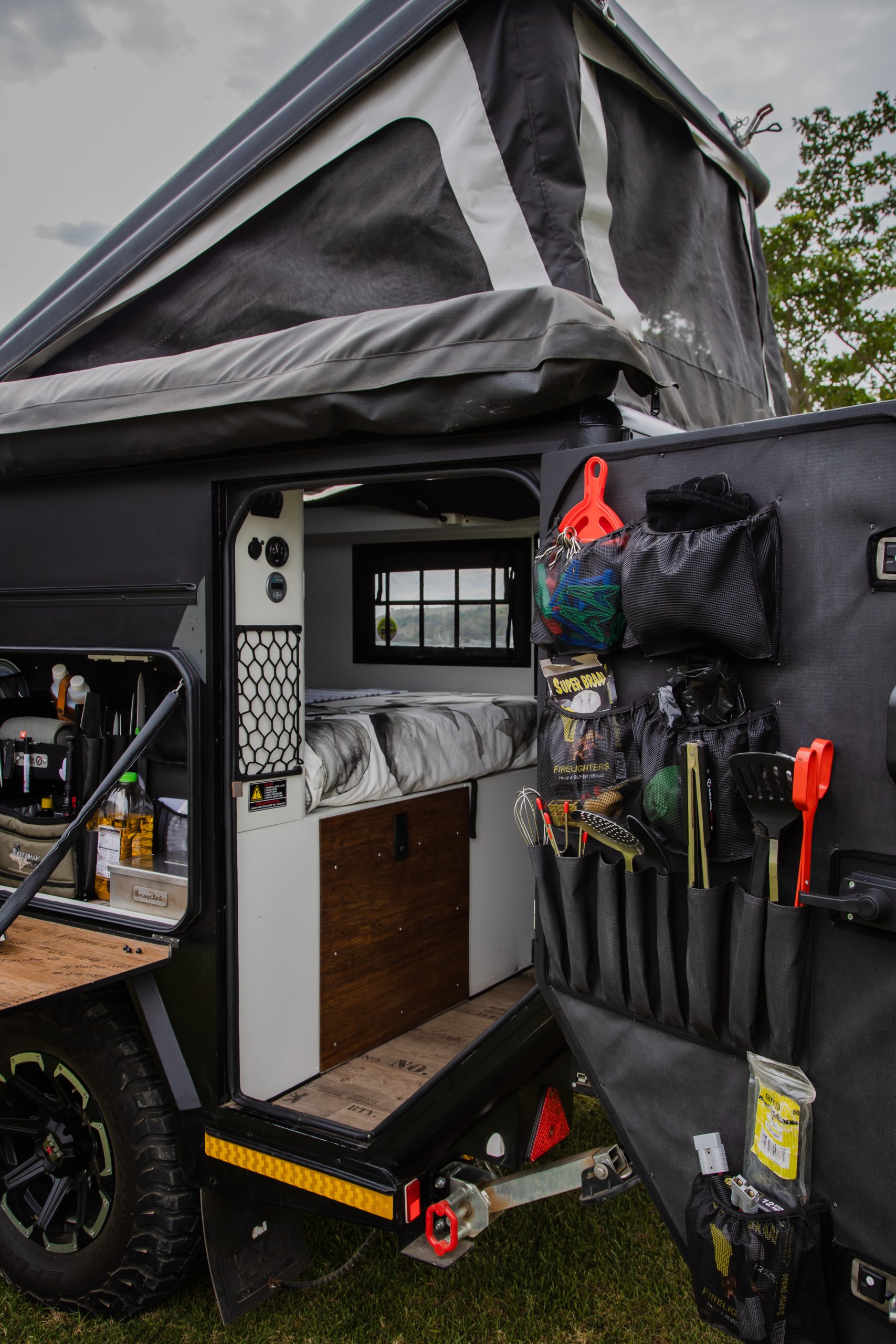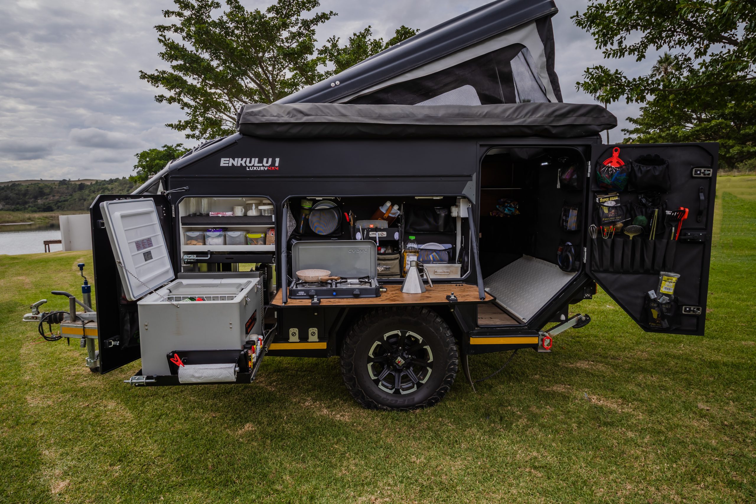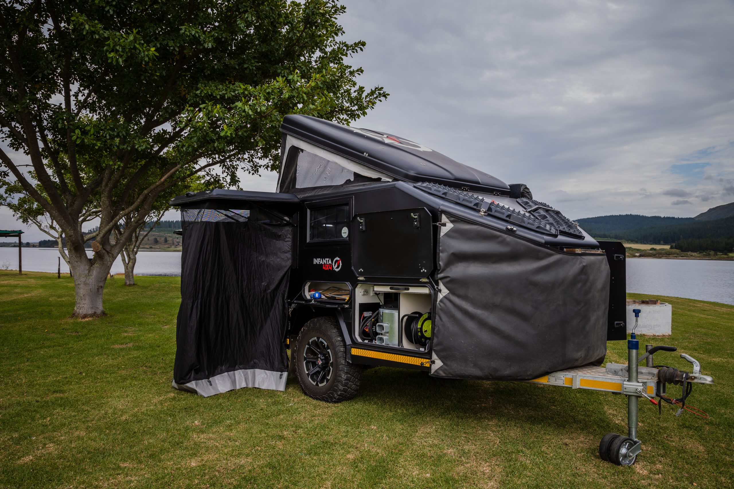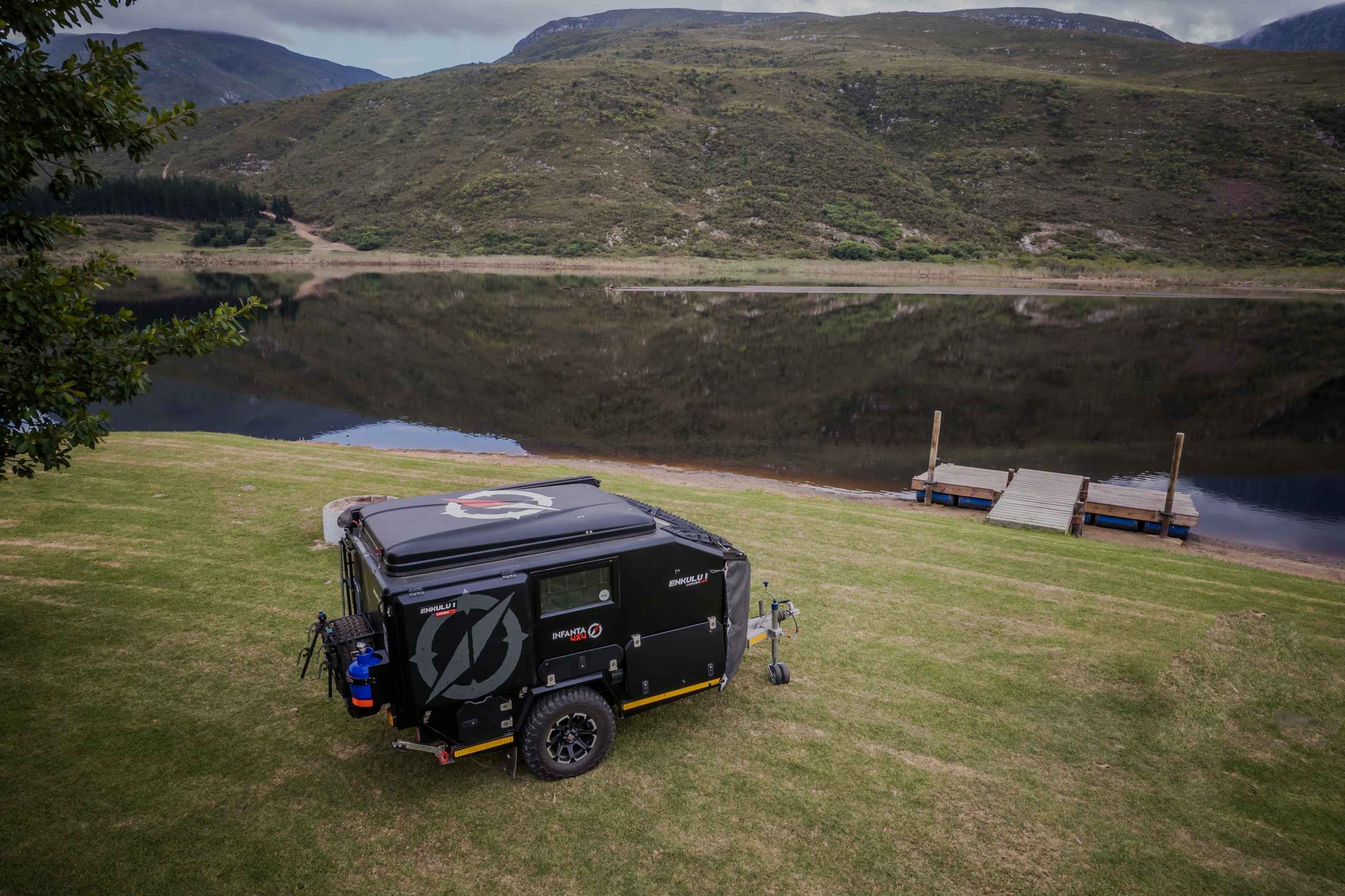 Discover the Infanta Enkulu 1, a compact and robust caravan designed for the adventurous at heart. Equipped with features that maximise both convenience and efficiency, this caravan offers a streamlined aerodynamic design, quick setup, and is crafted from durable aluminium and polycarbonate. Perfect for couples ready to explore, the Enkulu 1 includes a range of modern comforts such as LED lighting, a built-in battery system chargeable via your towing vehicle, and optional air conditioning. Whether tackling rugged 4×4 trails or enjoying a cosy setup under the stars, the Enkulu 1 provides a perfect blend of mobility and home-like comfort, equipped for any journey.